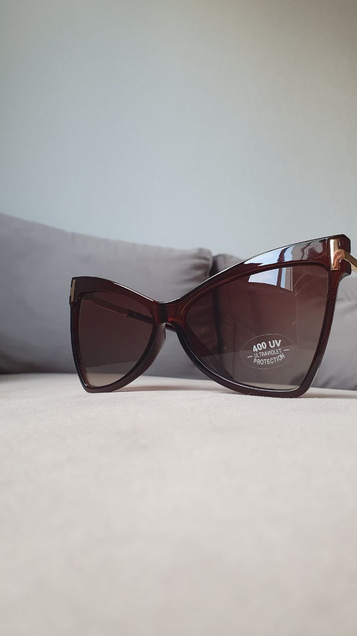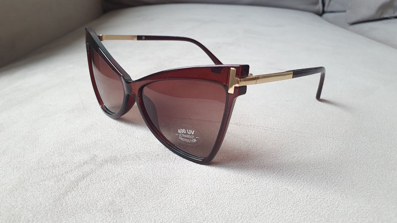 Очки в стиле «кошачий глаз» с линзами коричневого оттенка. Оправа имеет коричневый цвет с золотистыми элементами на дужках.